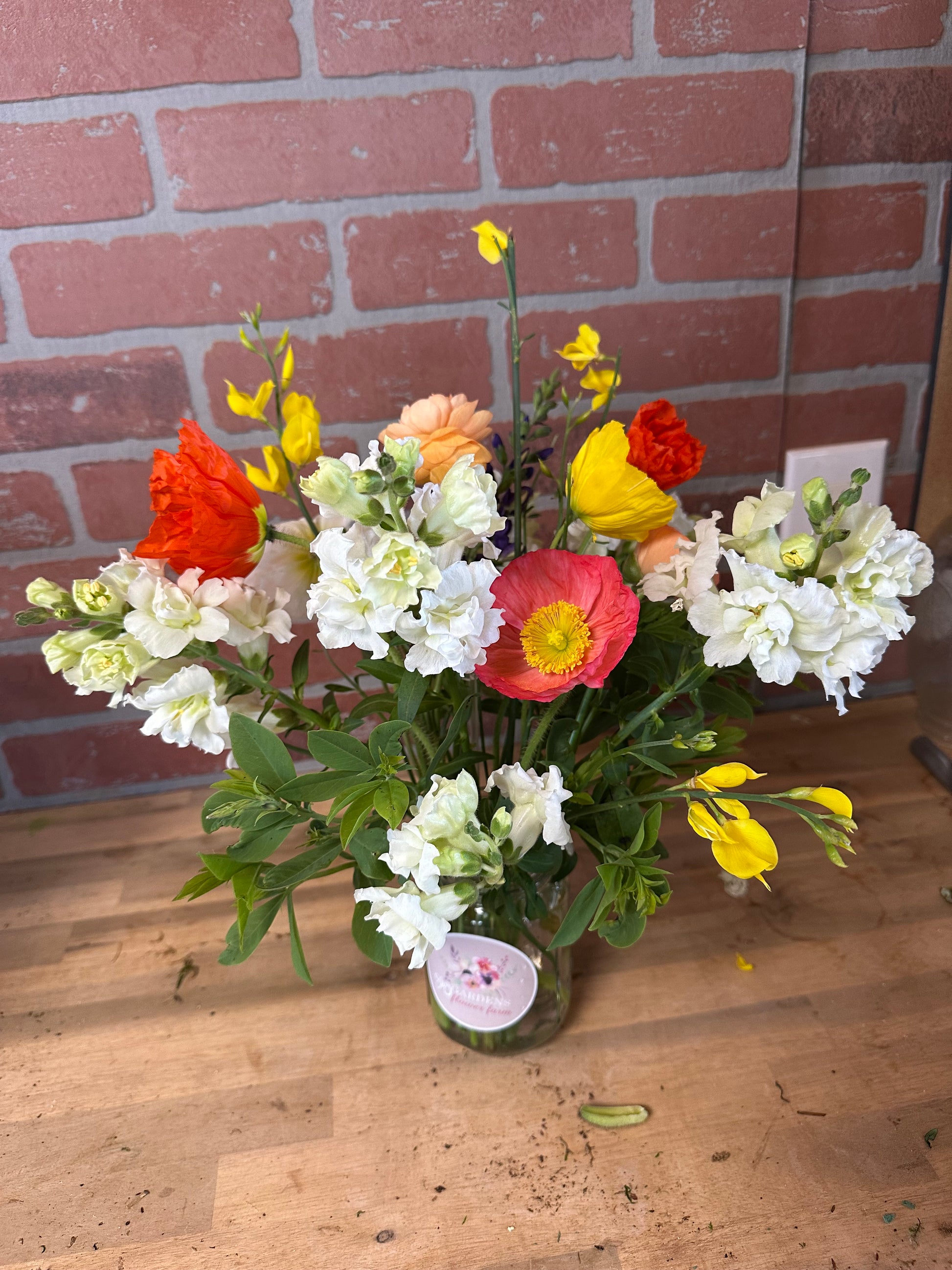 $35 💐 Jar filled with flowers from the farm as well as a couple blooms from wholesale to make the arrangement complete. The flowers from the farm are sure to be cut either the same day or day before for maximum freshness.